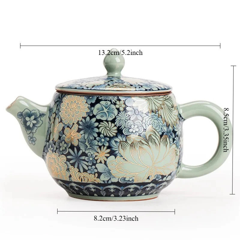 Parce qu’elle porte en elle la magie d’un savoir-faire ancestral. Inspirée des célèbres céramiques Ru de la dynastie Song, réputées pour leurs teintes célestes et leurs glaçures craquelées comme la surface d’un lac au lever du jour, cette théière incarne un héritage précieux. Les motifs de fleurs rôties glacées semblent figés dans le temps, comme si la chaleur du four avait capturé un éclat vivant, presque poétique.