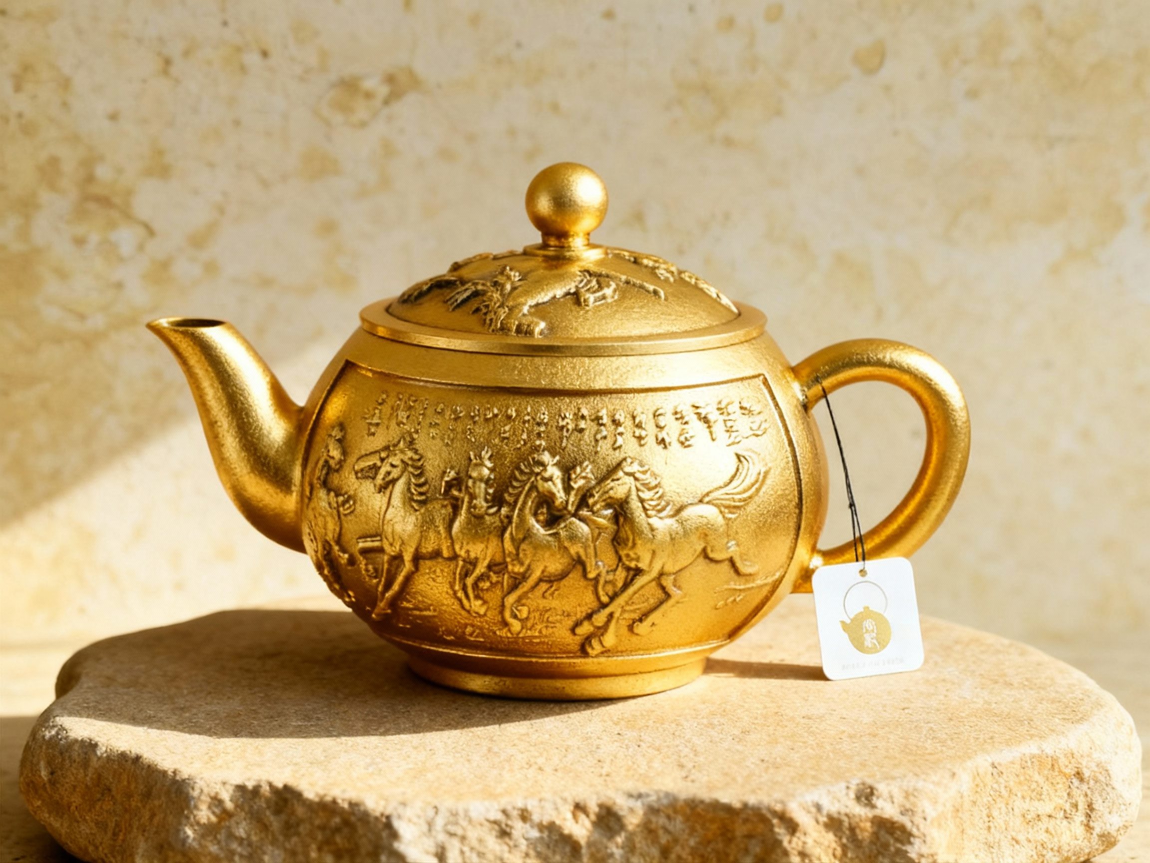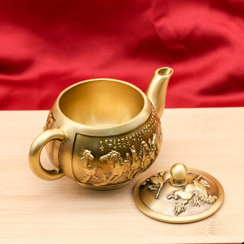 La Théière Vintage en Cuivre Sculpté est une pièce d’exception qui séduit par son esthétique noble et majestueuse. Sa surface entièrement sculptée met en scène des chevaux galopants, symbole de force, de liberté et de prospérité dans la culture asiatique. Chaque relief est minutieusement façonné, offrant une profondeur visuelle rare et rappelant les œuvres métalliques impériales.